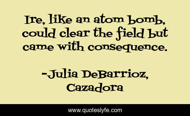 This page presents the quote "Ire, like an atom bomb, could clear the field but came with consequence.". Author of this quote is Julia DeBarrioz, Cazadora. .