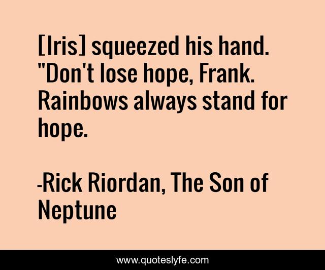 This page presents the quote "[Iris] squeezed his hand. "Don't lose hope, Frank. Rainbows always stand for hope.". Author of this quote is Rick Riordan, The Son of Neptune. This quote is about iris, frank-zhang, rainbows, heroes-of-olympus, the-son-of-neptune, percy-jackson-and-the-olympians, hope,.