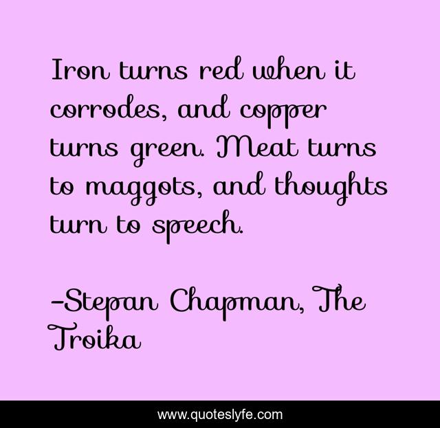 This page presents the quote "Iron turns red when it corrodes, and copper turns green. Meat turns to maggots, and thoughts turn to speech.". Author of this quote is Stepan Chapman, The Troika. This quote is about thoughts, words,.