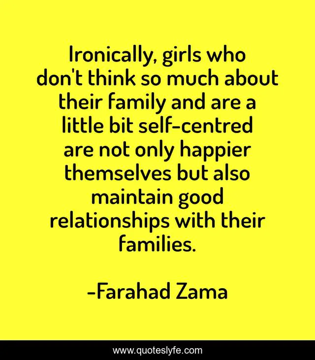 This page presents the quote "Ironically, girls who don't think so much about their family and are a little bit self-centred are not only happier themselves but also maintain good relationships with their families.". Author of this quote is Farahad Zama. .