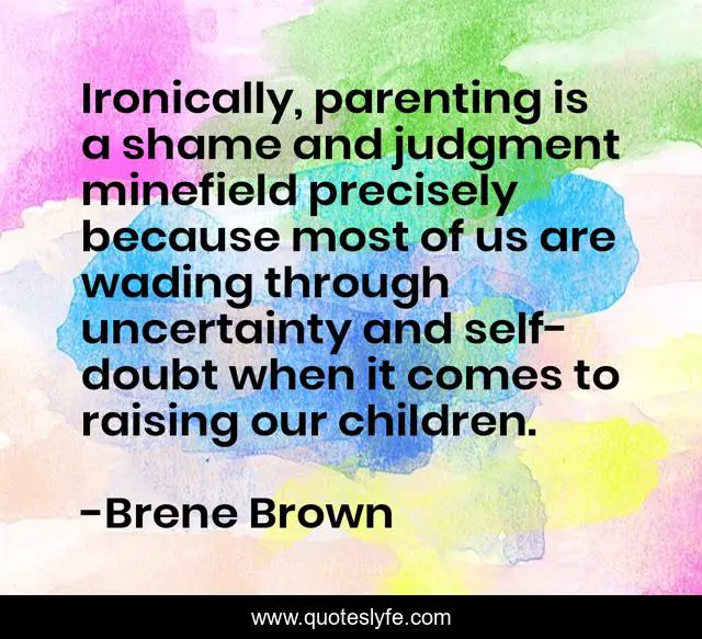 This page presents the quote "Ironically, parenting is a shame and judgment minefield precisely because most of us are wading through uncertainty and self-doubt when it comes to raising our children.". Author of this quote is Brene Brown. This quote is about shame, uncertainty, children,.