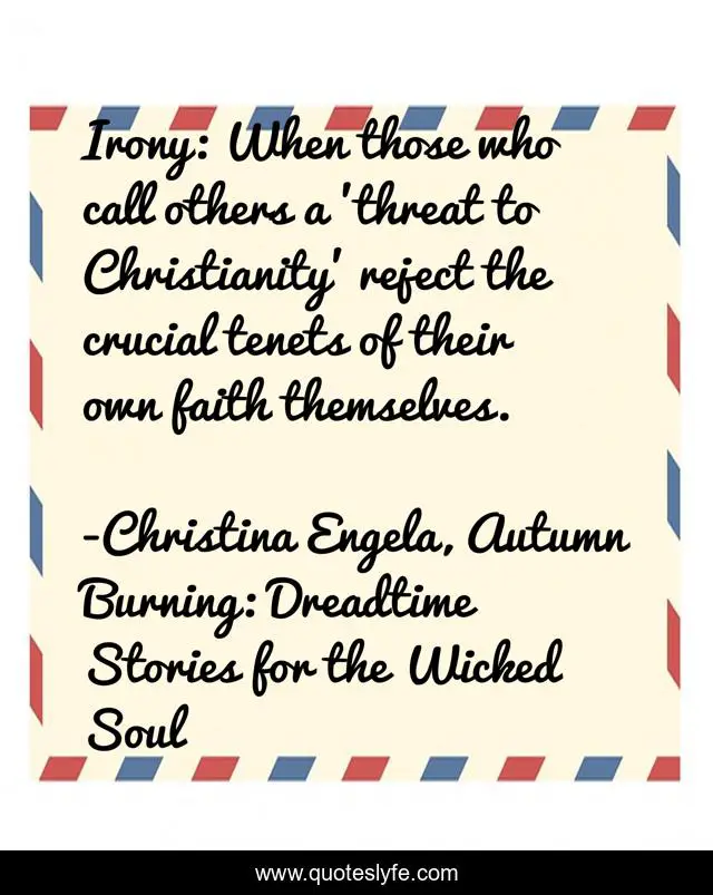 This page presents the quote "Irony: When those who call others a 'threat to Christianity' reject the crucial tenets of their own faith themselves.". Author of this quote is Christina Engela, Autumn Burning: Dreadtime Stories for the Wicked Soul. This quote is about faith, irony, christianity, threat, reject, crucial-tenets,.