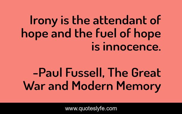 This page presents the quote "Irony is the attendant of hope and the fuel of hope is innocence.". Author of this quote is Paul Fussell, The Great War and Modern Memory. This quote is about irony, wwi, hope, innocence,.