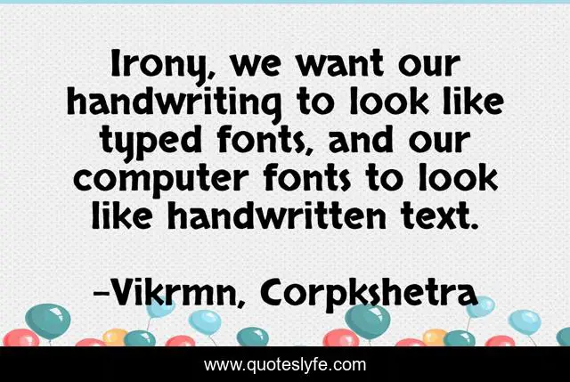 This page presents the quote "Irony, we want our handwriting to look like typed fonts, and our computer fonts to look like handwritten text.". Author of this quote is Vikrmn, Corpkshetra. This quote is about corpkshetra, confidence, fonts, vikram, computer, text, irony, motivational, ca-vikram-verma,.