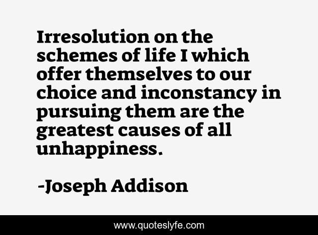 This page presents the quote "Irresolution on the schemes of life I which offer themselves to our choice and inconstancy in pursuing them are the greatest causes of all unhappiness.". Author of this quote is Joseph Addison. .