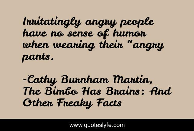 This page presents the quote "Irritatingly angry people have no sense of humor when wearing their “angry pants.". Author of this quote is Cathy Burnham Martin, The Bimbo Has Brains: And Other Freaky Facts. This quote is about humor, relationship, people, communication, men, behaviour, conversation, attitude, human,.