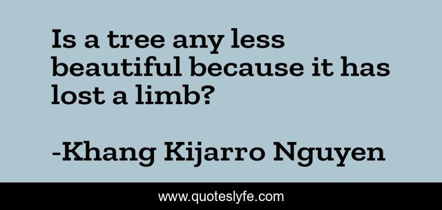 This page presents the quote "Is a tree any less beautiful because it has lost a limb?". Author of this quote is Khang Kijarro Nguyen. This quote is about disabiilty, losing-a-limb, beauty,.