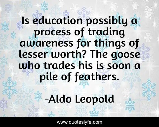 This page presents the quote "Is education possibly a process of trading awareness for things of lesser worth? The goose who trades his is soon a pile of feathers.". Author of this quote is Aldo Leopold. This quote is about process, feathers, awareness,.
