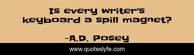 This page presents the quote "Is every writer's keyboard a spill magnet?". Author of this quote is A.D. Posey. This quote is about magnet, spill, keyboard, screenwriters, writing, write, screenwriting, writers, film,.