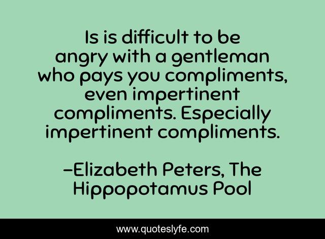 This page presents the quote "Is is difficult to be angry with a gentleman who pays you compliments, even impertinent compliments. Especially impertinent compliments.". Author of this quote is Elizabeth Peters, The Hippopotamus Pool. This quote is about men, amelia-peabody, compliment,.