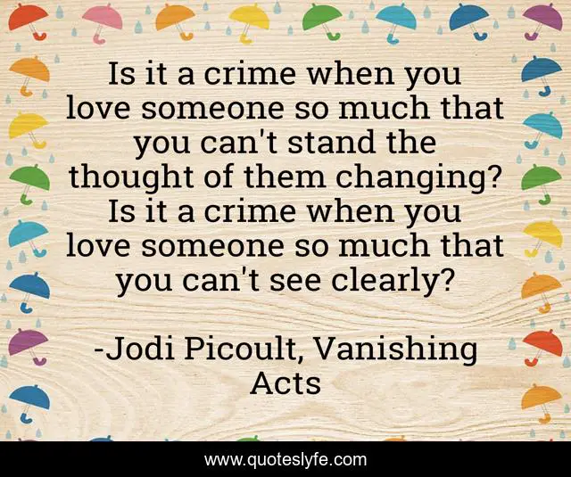 This page presents the quote "Is it a crime when you love someone so much that you can't stand the thought of them changing? Is it a crime when you love someone so much that you can't see clearly?". Author of this quote is Jodi Picoult, Vanishing Acts. This quote is about seeing, love, change, affection, crime,.