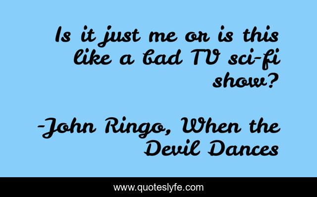 This page presents the quote "Is it just me or is this like a bad TV sci-fi show?". Author of this quote is John Ringo, When the Devil Dances. This quote is about entertainment, bad-books, sci-fi, self-deprecation,.