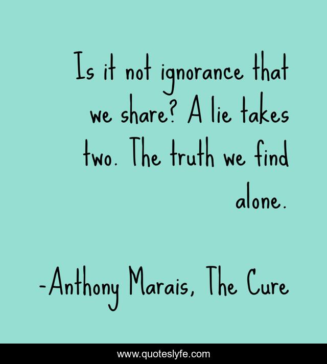 This page presents the quote "Is it not ignorance that we share? A lie takes two. The truth we find alone.". Author of this quote is Anthony Marais, The Cure. This quote is about ignorance, truth, lies-lying-liars,.