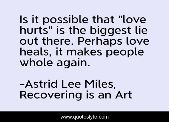 This page presents the quote "Is it possible that “love hurts” is the biggest lie out there. Perhaps love heals, it makes people whole again.". Author of this quote is Astrid Lee Miles, Recovering is an Art. This quote is about falling-in-love, love, affection, feelings-and-emotions,.
