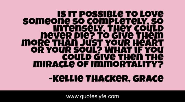 This page presents the quote "Is it possible to love someone so completely, so intensely, they could never die? To give them more than just your heart or your soul? What if you could give then the miracle of immortality?". Author of this quote is Kellie Thacker, Grace. This quote is about faith, redemption, supernatural-romance, trilogy, young-adult-romance, vampire, christian-fiction, new-adult, christian-supernatural-fiction,.