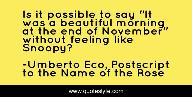 This page presents the quote "Is it possible to say "It was a beautiful morning at the end of November" without feeling like Snoopy?". Author of this quote is Umberto Eco, Postscript to the Name of the Rose. This quote is about originality, clichés, stereotypes, writing,.