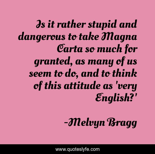 This page presents the quote "Is it rather stupid and dangerous to take Magna Carta so much for granted, as many of us seem to do, and to think of this attitude as 'very English?'". Author of this quote is Melvyn Bragg. This quote is about dangerous, stupid, think,.