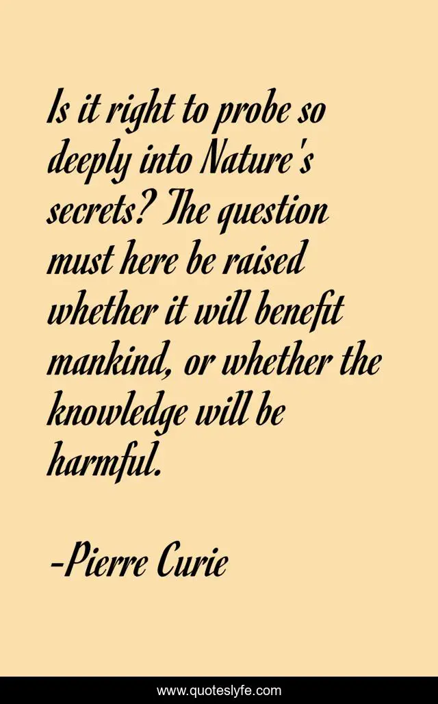 This page presents the quote "Is it right to probe so deeply into Nature's secrets? The question must here be raised whether it will benefit mankind, or whether the knowledge will be harmful.". Author of this quote is Pierre Curie. This quote is about secrets, question, knowledge,.