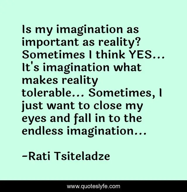 This page presents the quote "Is my imagination as important as reality? Sometimes I think YES... It's imagination what makes reality tolerable... Sometimes, I just want to close my eyes and fall in to the endless imagination...". Author of this quote is Rati Tsiteladze. This quote is about imagination, reality,.