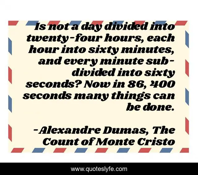 This page presents the quote "Is not a day divided into twenty-four hours, each hour into sixty minutes, and every minute sub-divided into sixty seconds? Now in 86, 400 seconds many things can be done.". Author of this quote is Alexandre Dumas, The Count of Monte Cristo. .