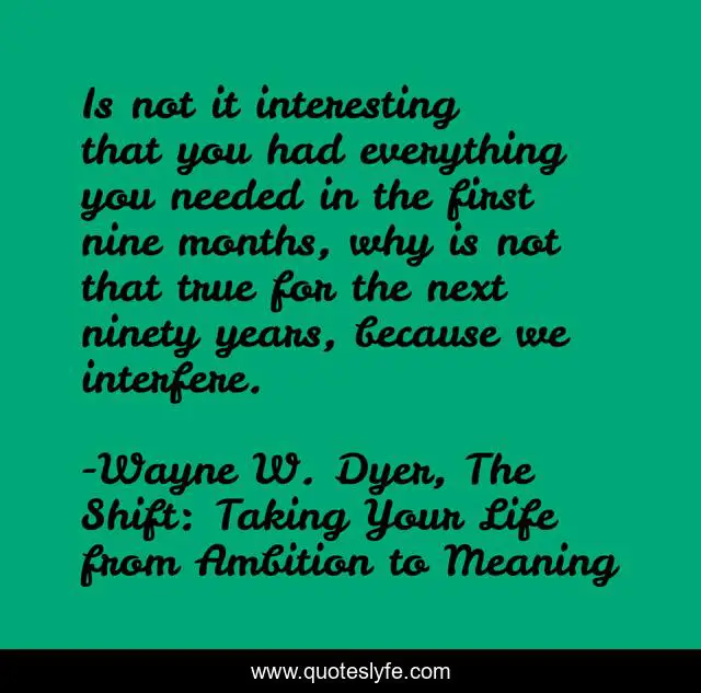 This page presents the quote "Is not it interesting that you had everything you needed in the first nine months, why is not that true for the next ninety years, because we interfere.". Author of this quote is Wayne W. Dyer, The Shift: Taking Your Life from Ambition to Meaning. This quote is about need, interfere,.