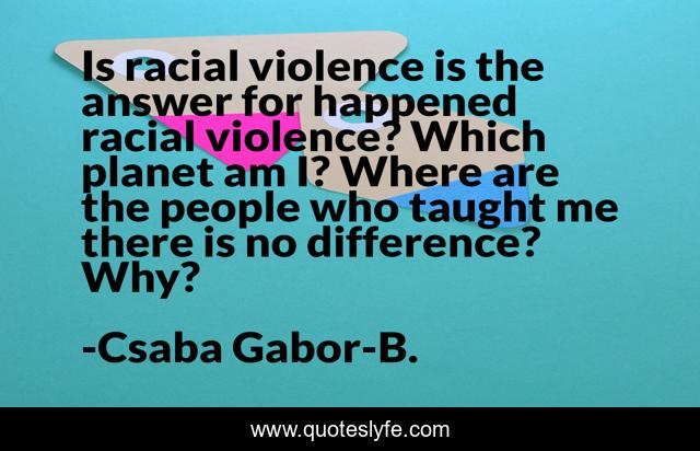This page presents the quote "Is racial violence is the answer for happened racial violence? Which planet am I? Where are the people who taught me there is no difference? Why?". Author of this quote is Csaba Gabor-B.. This quote is about people, violence, racial-profiling, racism, race, racist,.