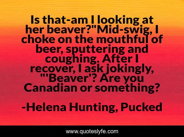 This page presents the quote "Is that-am I looking at her beaver?"Mid-swig, I choke on the mouthful of beer, sputtering and coughing. After I recover, I ask jokingly, "'Beaver'? Are you Canadian or something?". Author of this quote is Helena Hunting, Pucked. This quote is about humorous, pucked, violet-hall, alex-waters,.