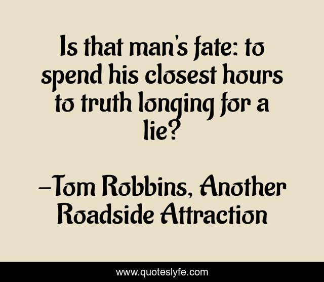 This page presents the quote "Is that man's fate: to spend his closest hours to truth longing for a lie?". Author of this quote is Tom Robbins, Another Roadside Attraction. .