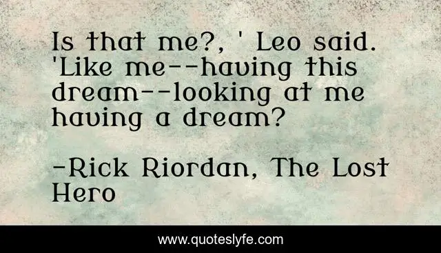 This page presents the quote "Is that me?, ' Leo said. 'Like me--having this dream--looking at me having a dream?". Author of this quote is Rick Riordan, The Lost Hero. This quote is about confusion, hephaestus, dreams, leo,.