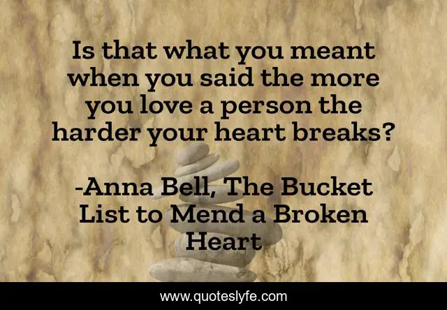 This page presents the quote "Is that what you meant when you said the more you love a person the harder your heart breaks?". Author of this quote is Anna Bell, The Bucket List to Mend a Broken Heart. This quote is about broken-heart, break-up, love, bucket-list, affection,.