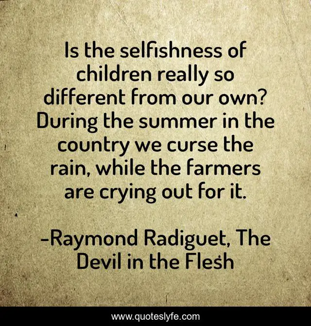 This page presents the quote "Is the selfishness of children really so different from our own? During the summer in the country we curse the rain, while the farmers are crying out for it.". Author of this quote is Raymond Radiguet, The Devil in the Flesh. This quote is about selfishness, human-nature, children,.