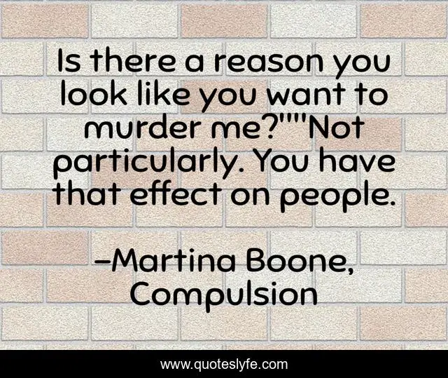 This page presents the quote "Is there a reason you look like you want to murder me?""Not particularly. You have that effect on people.". Author of this quote is Martina Boone, Compulsion. This quote is about murder, human-interactions, effect-on-people, martina-boone, human-interaction, compulsion,.