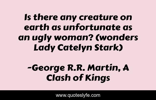 This page presents the quote "Is there any creature on earth as unfortunate as an ugly woman? (wonders Lady Catelyn Stark)". Author of this quote is George R.R. Martin, A Clash of Kings. This quote is about ugliness, woman, prescriptions,.