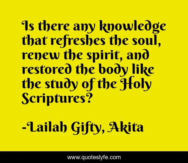 This page presents the quote "Is there any knowledge that refreshes the soul, renew the spirit, and restored the body like the study of the Holy Scriptures?". Author of this quote is Lailah Gifty, Akita. This quote is about refreshes, holy-scripture, christian, educational-philosophy, soul, renew, spirit, knowledge,.