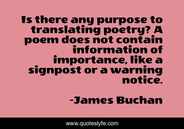 This page presents the quote "Is there any purpose to translating poetry? A poem does not contain information of importance, like a signpost or a warning notice.". Author of this quote is James Buchan. This quote is about information, purpose, like,.