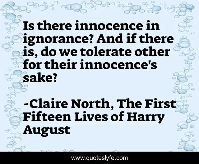 This page presents the quote "Is there innocence in ignorance? And if there is, do we tolerate other for their innocence's sake?". Author of this quote is Claire North, The First Fifteen Lives of Harry August. This quote is about ignorance, innocence-and-experience,.