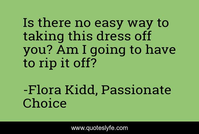This page presents the quote "Is there no easy way to taking this dress off you? Am I going to have to rip it off?". Author of this quote is Flora Kidd, Passionate Choice. This quote is about lust, undressing, impatience,.