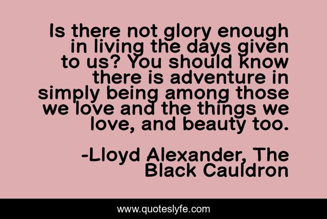This page presents the quote "Is there not glory enough in living the days given to us? You should know there is adventure in simply being among those we love and the things we love, and beauty too.". Author of this quote is Lloyd Alexander, The Black Cauldron. This quote is about beauty-in-nature, love, adventure, affection,.