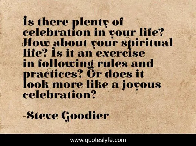 This page presents the quote "Is there plenty of celebration in your life? How about your spiritual life? Is it an exercise in following rules and practices? Or does it look more like a joyous celebration?". Author of this quote is Steve Goodier. This quote is about spiritual, spiritual-wisdom, joy, joyful-living, religion, spiritual-life, celebrate, celebration,.
