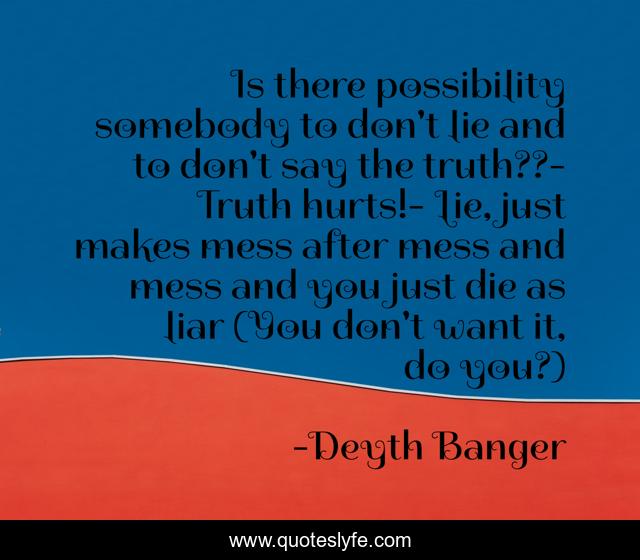 This page presents the quote "Is there possibility somebody to don't lie and to don't say the truth??- Truth hurts!- Lie, just makes mess after mess and mess and you just die as liar (You don't want it, do you?)". Author of this quote is Deyth Banger. This quote is about lie, somebody, possibility, possibilities, truth, hurts,.
