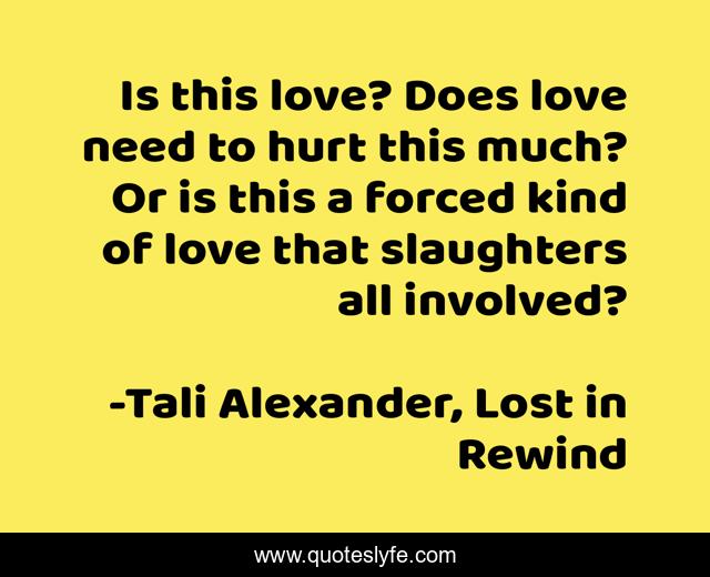 This page presents the quote "Is this love? Does love need to hurt this much? Or is this a forced kind of love that slaughters all involved?". Author of this quote is Tali Alexander, Lost in Rewind. This quote is about love, love-story, affection, love-hurts,.