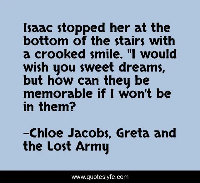 This page presents the quote "Isaac stopped her at the bottom of the stairs with a crooked smile. "I would wish you sweet dreams, but how can they be memorable if I won't be in them?". Author of this quote is Chloe Jacobs, Greta and the Lost Army. This quote is about goblins, parallel-universes, epic-fantasy, demons, gnomes, sprites, fae,.