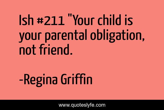 This page presents the quote "Ish #211 "Your child is your parental obligation, not friend.". Author of this quote is Regina Griffin. This quote is about motivation, inspirig, positive, motivational, confidence, optimistic, truth-insprational,.