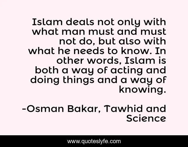 This page presents the quote "Islam deals not only with what man must and must not do, but also with what he needs to know. In other words, Islam is both a way of acting and doing things and a way of knowing.". Author of this quote is Osman Bakar, Tawhid and Science. This quote is about philosophy, islam,.