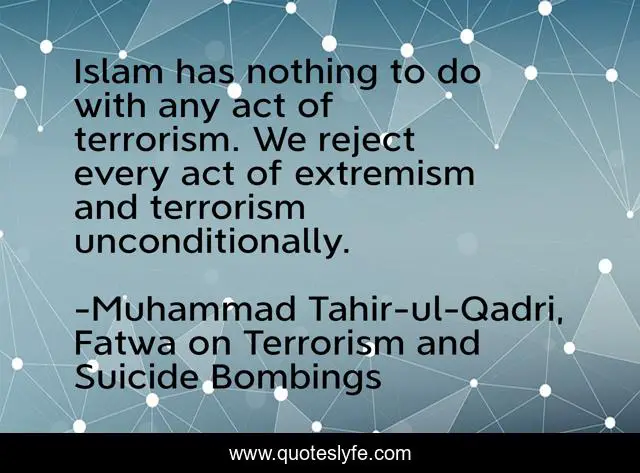 This page presents the quote "Islam has nothing to do with any act of terrorism. We reject every act of extremism and terrorism unconditionally.". Author of this quote is Muhammad Tahir-ul-Qadri, Fatwa on Terrorism and Suicide Bombings. This quote is about terrorism, fatwa,.
