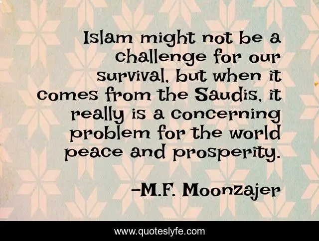 This page presents the quote "Islam might not be a challenge for our survival, but when it comes from the Saudis, it really is a concerning problem for the world peace and prosperity.". Author of this quote is M.F. Moonzajer. This quote is about prosperity, saudis, challenge, peace, survival, islam,.