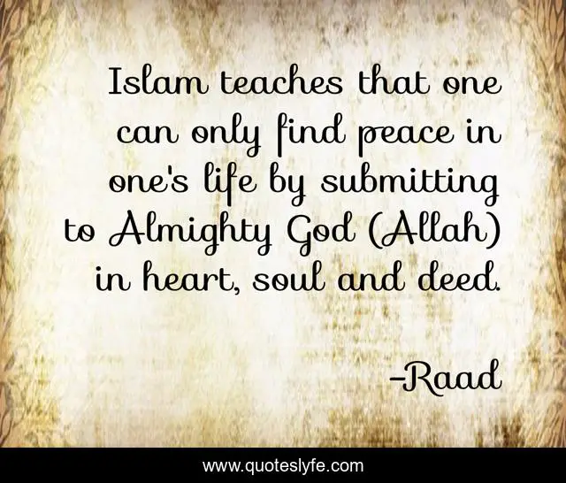 This page presents the quote "Islam teaches that one can only find peace in one's life by submitting to Almighty God (Allah) in heart, soul and deed.". Author of this quote is Raad. .