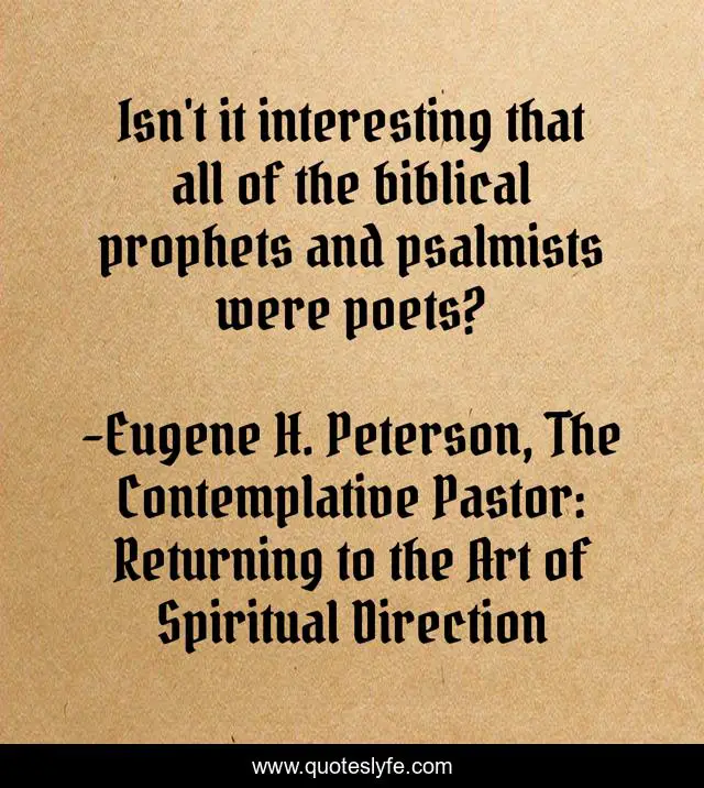 This page presents the quote "Isn't it interesting that all of the biblical prophets and psalmists were poets?". Author of this quote is Eugene H. Peterson, The Contemplative Pastor: Returning to the Art of Spiritual Direction. This quote is about enthusiasm, religious, inspirational, christianity,.