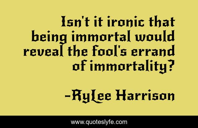 This page presents the quote "Isn't it ironic that being immortal would reveal the fool's errand of immortality?". Author of this quote is RyLee Harrison. This quote is about continuity, death, continuity-of-being, immortal, immortality, fool-s-errand,.