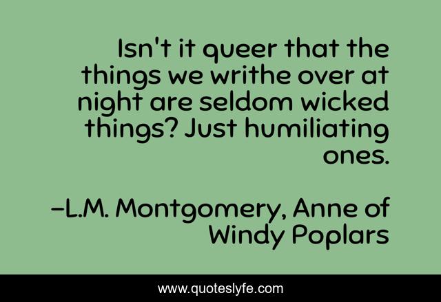 This page presents the quote "Isn't it queer that the things we writhe over at night are seldom wicked things? Just humiliating ones.". Author of this quote is L.M. Montgomery, Anne of Windy Poplars. This quote is about l-m-montgomery, night,.